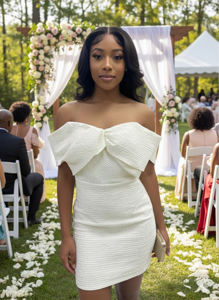 Chic beige bodycon short dress featuring a stylish bow tie on the chest. Perfect for parties, date nights, and elegant casual looks.