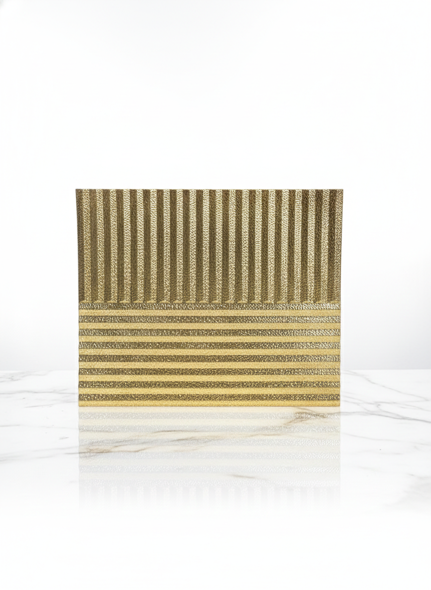Add a touch of high-concept glamour to your home with our Ribbed Metallic Display Plate. Measuring 13.5 inches by 13 inches, this versatile piece features an interlocking linear pattern that mimics the precision of Art Deco architecture. Available in radiant gold or cool silver, the high-quality synthetic construction offers the look of heavy metal with the durability and lightweight ease of premium polymers. Perfect for coffee tables, consoles, or as a standalone art piece.